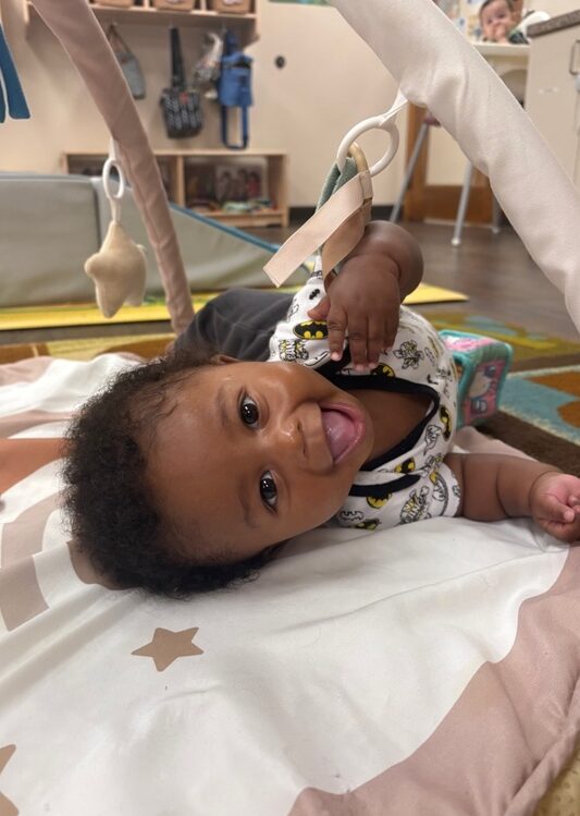 Our infant rooms follow a 1 to 5 ratio with experienced teachers passionate about this age group. Developmental milestone we observe and encourage vary based on the specific age of your child. For example, a 3 month old might be working on and/or demonstrating their “social smile” milestone whereas a 10 month old would be working towards pushing themselves up and sitting up unassisted.